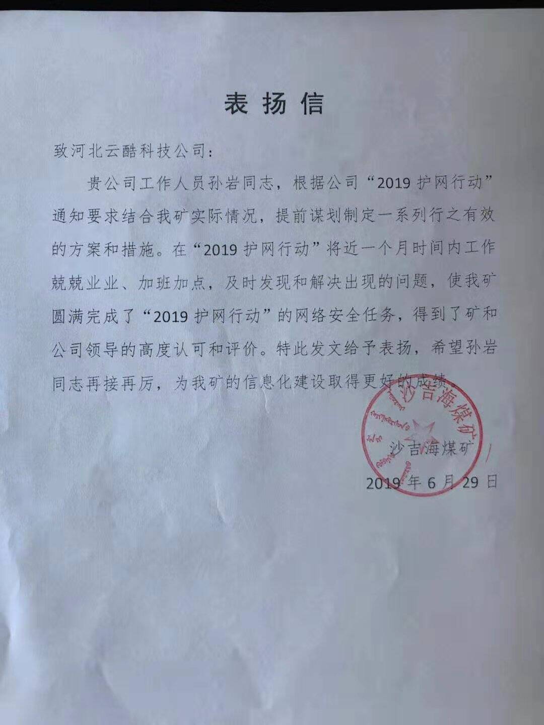 云酷科技運維服務部的四位同事憑借優異的技術實力和敬業精神,在本次的演練行動中獲得某煤電有限公司的高度贊揚,并向我司發來了表揚信: